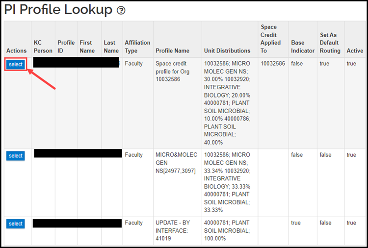 Note: The PI Profile is also where space credit is indicated. In the above screenshot see the Space Credit Applied To column. If there is nothing in the box, the profile does not include space credit. If there is an org number in the box, it indicates that the profile includes space credit for the org number displayed.