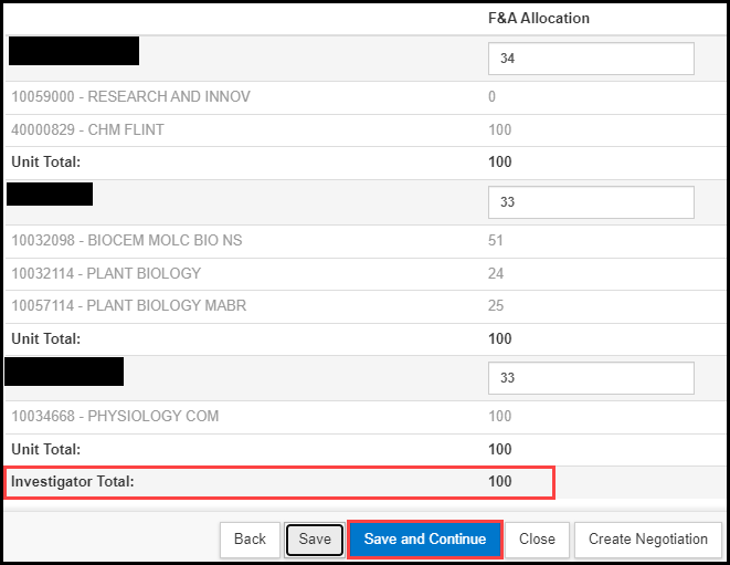 Unit Credit lines – The Unit Credit lines encompass all of the units included in an investigators profile, which appear in the white lines underneath each Investigator line. Distribution among the unit credit lines for each investigator must add to 100%. The Unit Credit lines are outlined in blue in the screenshot below.