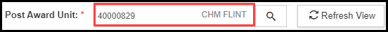 Post Award Unit column ‐ The column that displays the Post Award Unit that will be responsible for bookkeeping should the proposal be funded. The Post Award Unit is identified by 100 in the Investigator line and 100 in the Unit Credit line underneath that investigator.