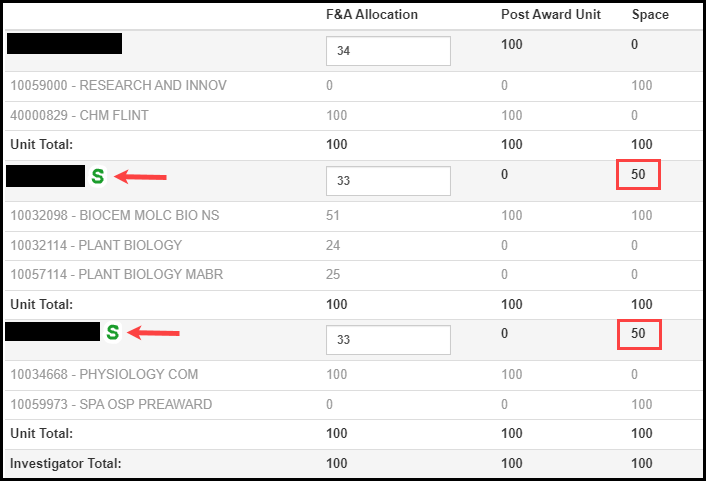 - If any of the investigators have space credit a green indicator box with an “S” will be displayed next to their name. In the Space column, the Investigator lines will be evenly split among any investigators who have space credit, and the unit that is receiving the space credit will be listed as 100 for the investigator(s). The below example shows that only one investigator has space credit, which is assigned to Org 10032098.