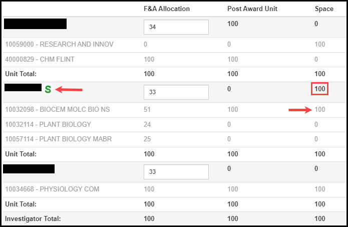 - If none of the investigators have space credit, the percentages in the Space column will match the percentages in the F&A Allocation column.